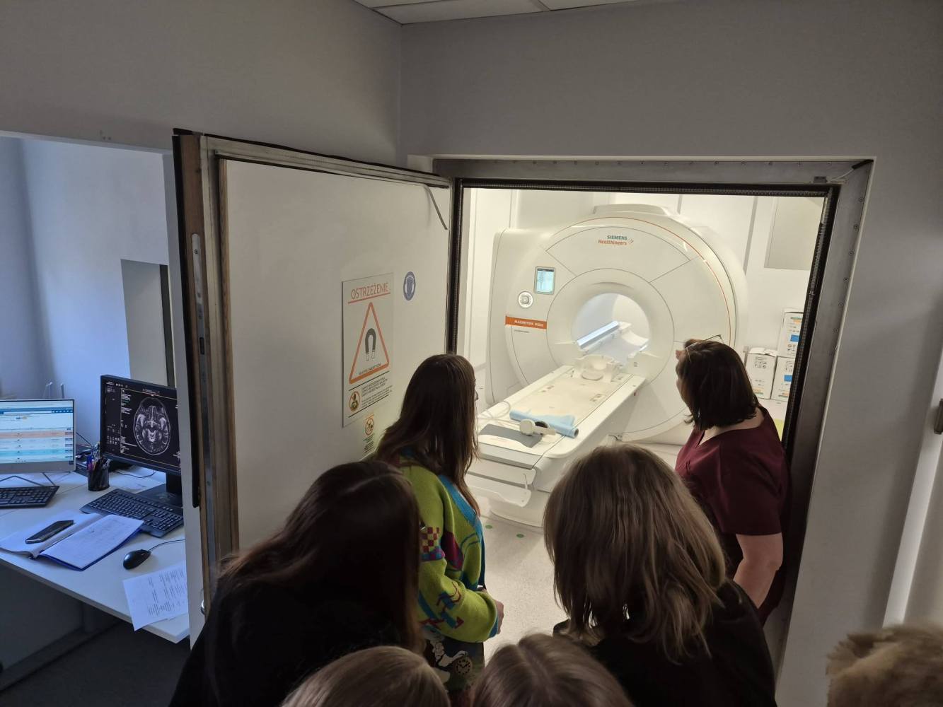 Uczniowie mogli również zapoznać się ze specyficzną aranżacją sali opisów i zasadami opisywania wyników badań. Dzięki uprzejmości pani doktor ochotnicy mogli samodzielnie wykonać badanie USG oraz wjechać do wnętrza pierścienia aparatu TK