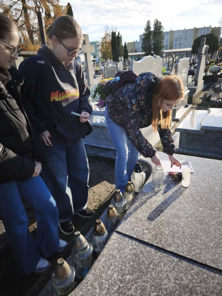 W ramach akcji Szkoła Pamiętam wolontariusze naszej szkoły wraz z opiekunkami — panią Magdąlena Konrad i panią Marią Wesołkowską — odwiedzili cmentarz parafialny w Ostrowi Mazowieckiej. Uczniowie zapalili znicze na grobach byłych dyrektorów, nauczycieli i pracowników szkoły, oddając im cześć i wyrażając wdzięczność za ich pracę oraz wkład w rozwój naszej społeczności.