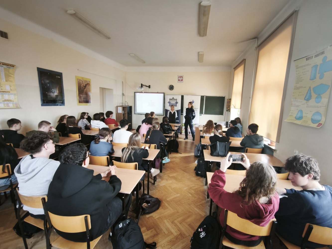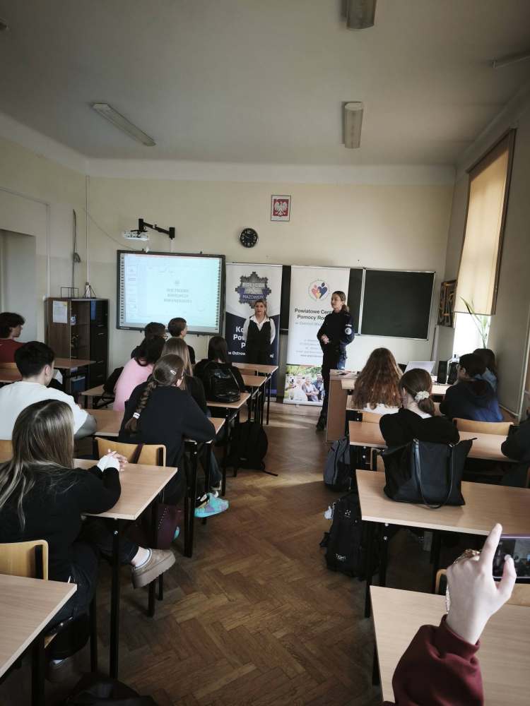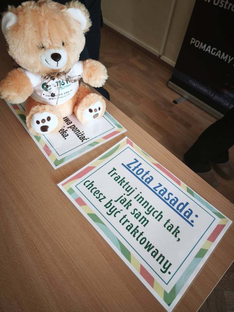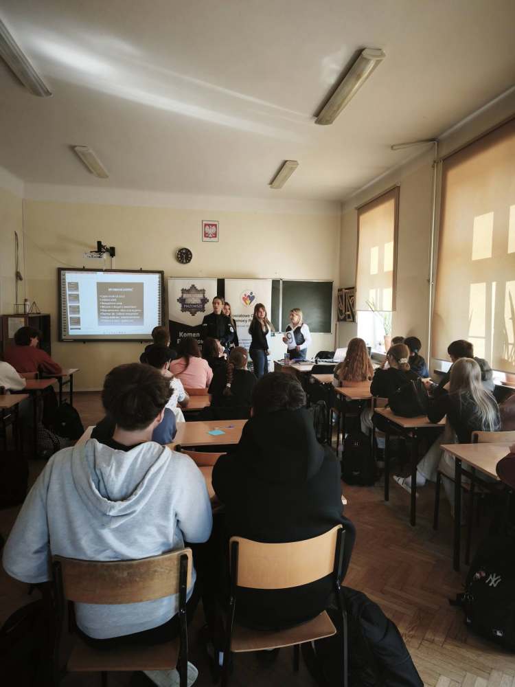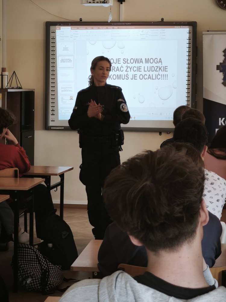 Następnie pani mł.asp.Emila Podbielska zaprezentowała film dotyczący hejtu oraz omówiła kwestie odpowiedzialności karnej związanej z przemocą słowną. Uczniowie mogli uświadomić sobie, że słowa, choć niewidoczne – mogą mieć realne konsekwencje prawne i emocjonalne.