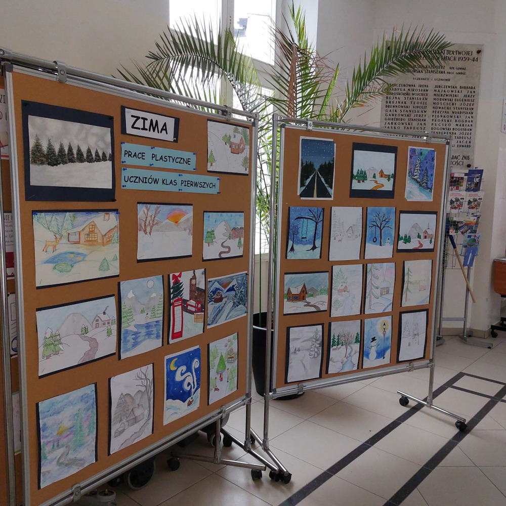 Zima jest tematem prac plastycznych, które w ramach plastyki wykonali licealiści klas pierwszych. W wyniku ich działalności powstało i wpłynęło do biblioteki 50 obrazów. Powstały z wykorzystaniem różnorodnych metod tworzenia, obejmujących rysunek, malarstwo i techniki mieszane. Niestety, ze względu na ograniczoną przestrzeń przeznaczoną na prezentację dzieł, wspólnie z wolontariuszkami : Alicją Grabowską IF, Julią Kurpiewską IF, Zofią Kimak IB i Mają Szymańską IB wybrałyśmy 28 kompozycji, które od 4 lutego można oglądać na wystawie znajdującej się tradycyjnie na I piętrze. Wybór prac był trudny i jak zawsze subiektywny.